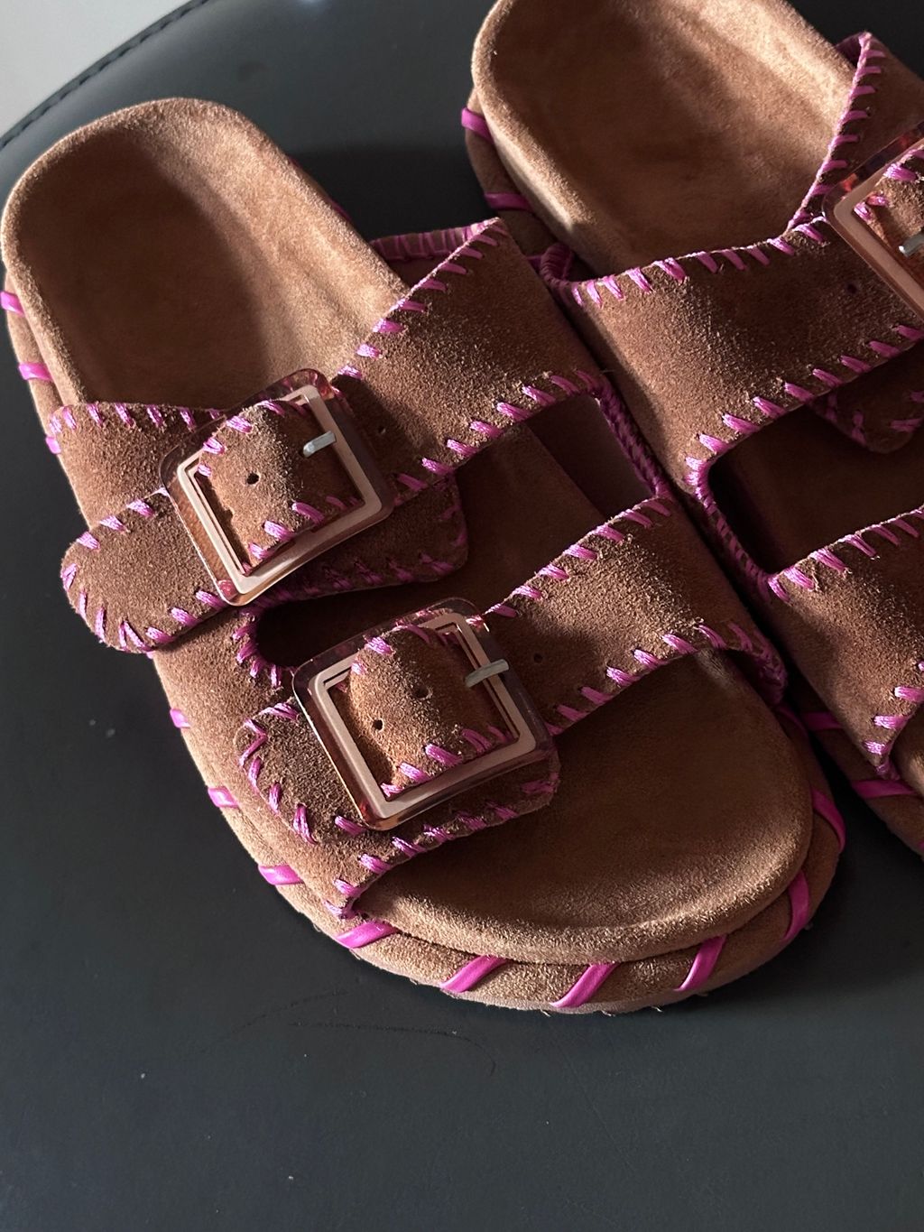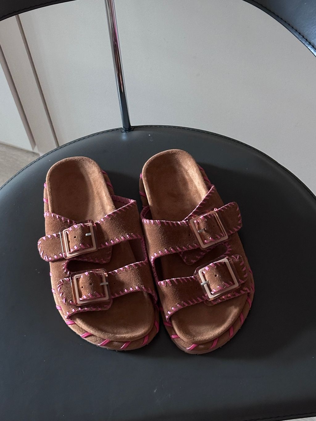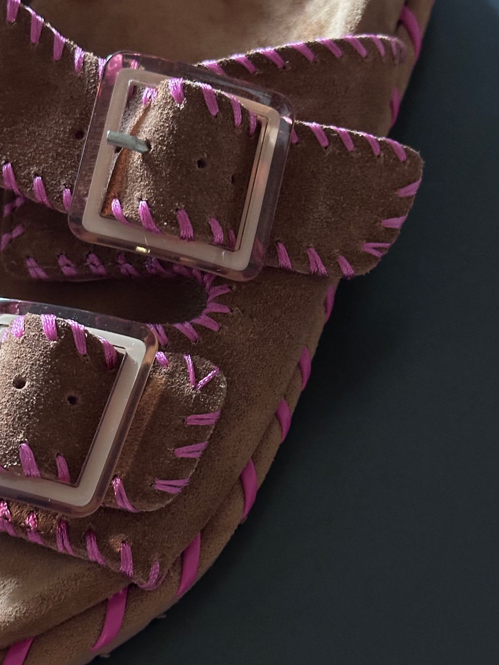 以溫潤的麂皮質感為基底,搭配雙帶金屬釦環設計,