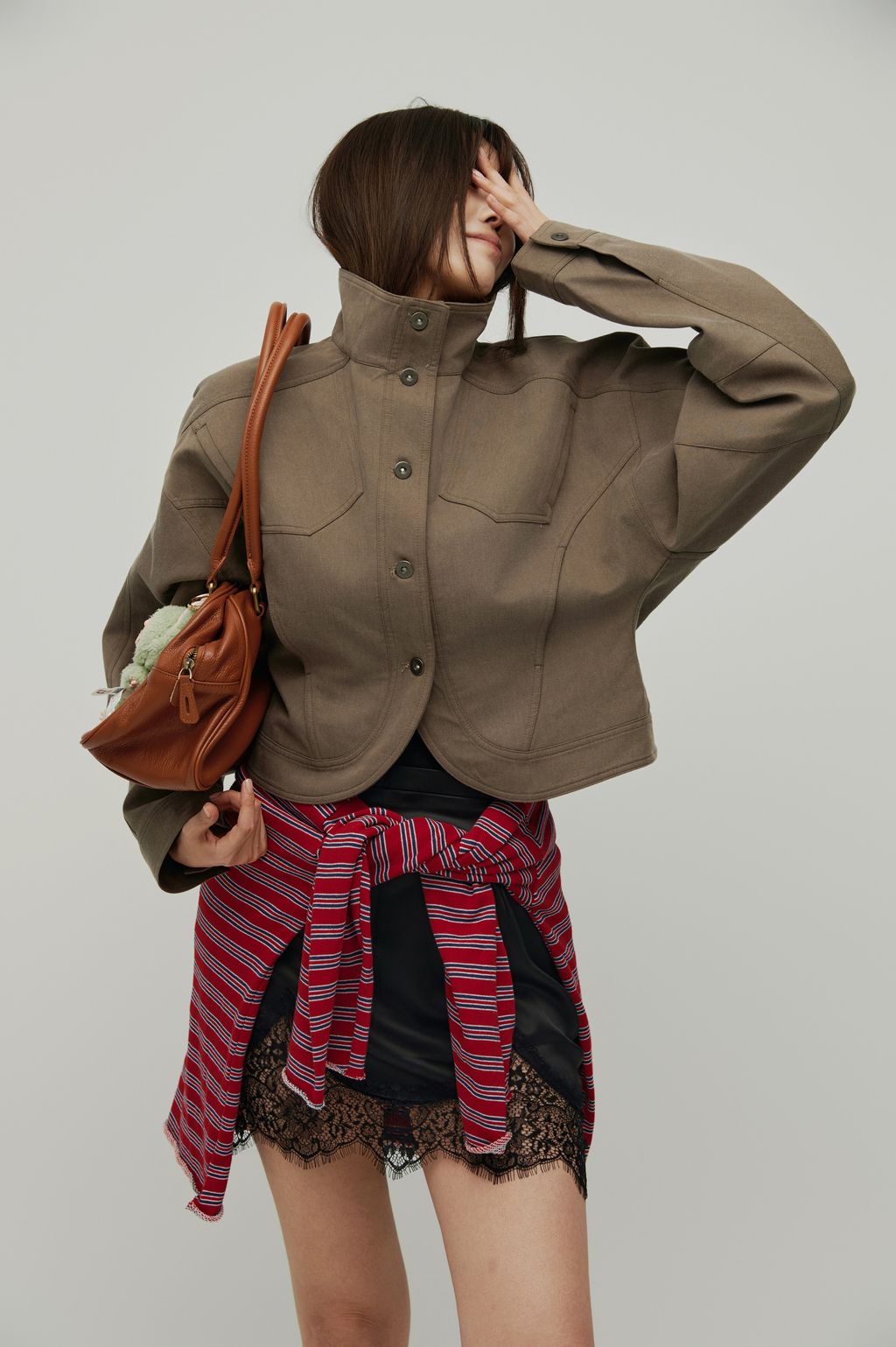 獨特的弧形下擺剪裁搭配高領與落肩設計,