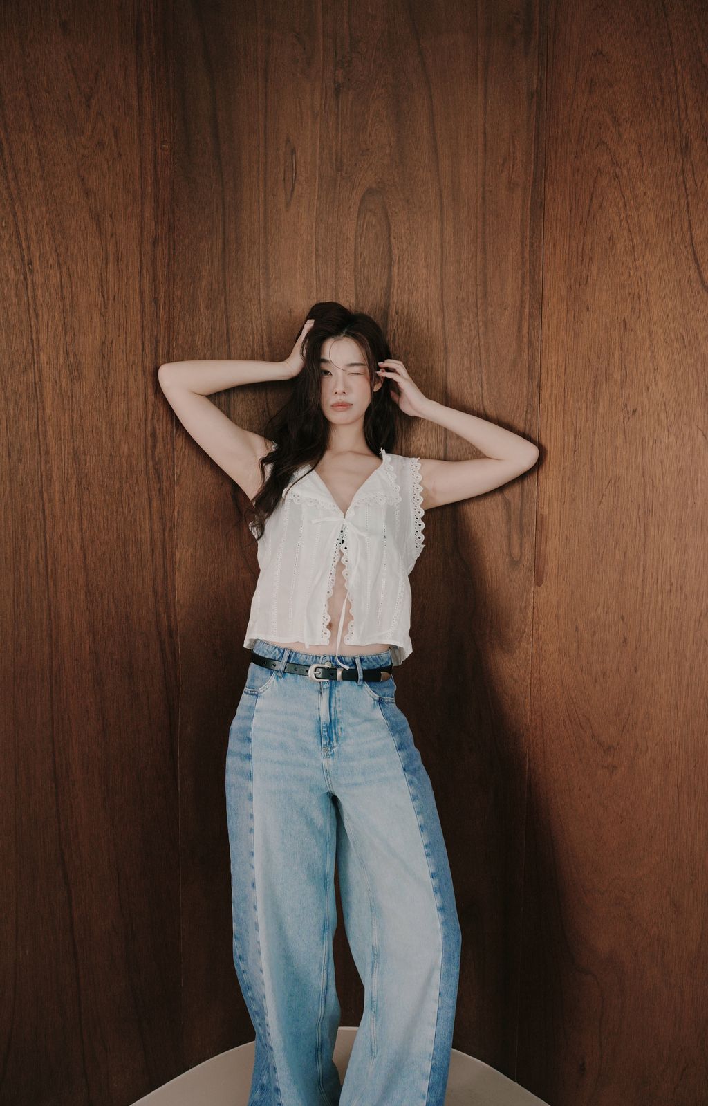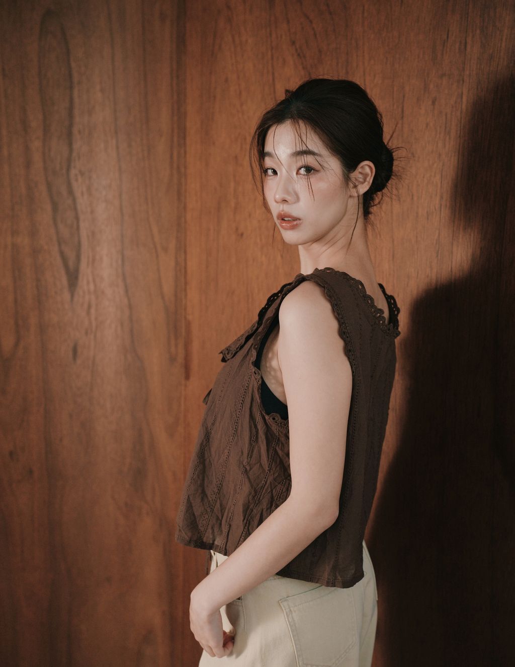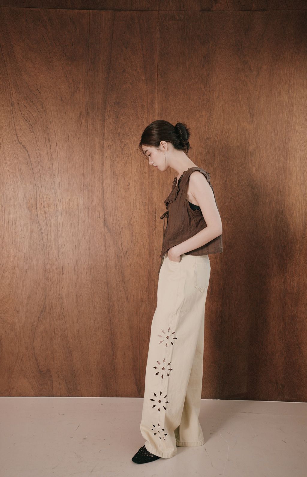 展現復古浪漫氣息。版型為 微短襬剪裁,